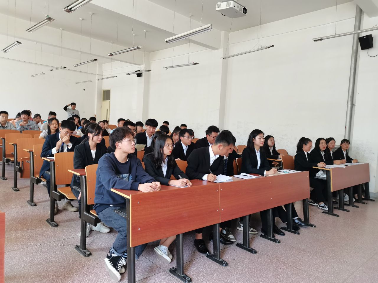 活动伴随着主持人的精彩讲说拉开序幕。首先每一位面试者依次上台在黑板上写出自己的班级、姓名和联系方式,再进行自我介绍并说明自己的意向部门1和意向部门2。与此同时,各位面试官也对他们提出一些相应的问题,以便对他们加入意向部门的理由等有所了解。整个会场中气氛活跃、井然有序,所有面试成员认真的思考面试官提出的问题并以最简洁清晰的语句回答这些问题。此外,面试官也通过举个别例子的形式让面试者们设身处地的思考,当遇到各种比较棘手的情况时该如何处理,这也是对他们的一种考验。最后活动在主持人的总结中落下帷幕。
